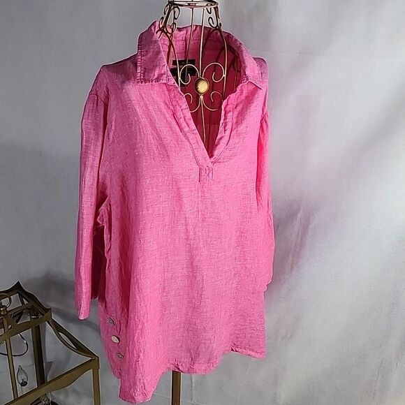 Beautiful pink 100% Linen tunic size 1X. Features a collar, v~neckline, 3/4 sleeves, mother of pearl buttons at sides. Tropical winter getaway? This one needs to be in your suitcase!