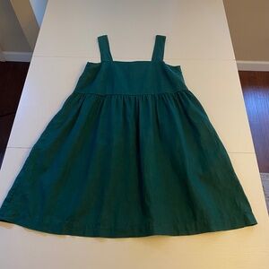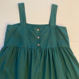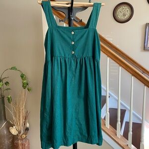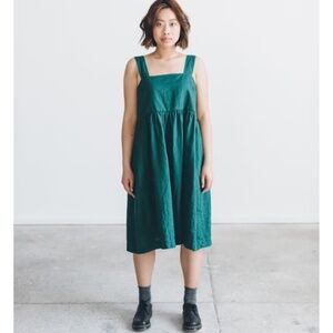 Linenfox Mini Summer Midi Dress in Emerald Green color. Made in Lithuania. Worn gently. In great pre-owned condition ! Size medium, in emerald green color. Loose-fitting cut. Unlined. Flowy skirt design. Shoulder straps. Gathered bust seam with pleats. Side pockets. Wooden button opening on the back. 100% high quality linen. Medium weight linen, which is pre-washed and softened during the fabric manufacturing process. Material care from manufacturer's website: Washed in low-temperature water (30-40C) on a gentle cycle. Avoid tumble drying. Hang line dry. Low iron inside out. There is no material composition label. This can be checked from manufacturer's website. Approx. flat measurements: Chest pit to pit: 19" Length top of shoulder strap to hem: 39.5"
