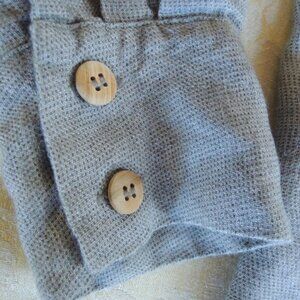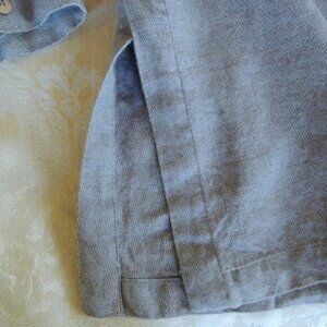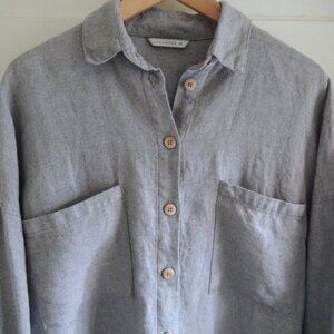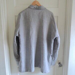 Linenfox gray Vika shirt in linen & wool blend, size Extra Small. (This shirt is VERY oversized and could easily fit a medium or large - please check measurements below.) Ethically made in Lithuania, this soft, durable, gray-blue shirt is a blend of linen and 15% natural recycled wool. Loose fitting, with an oversized design, drop-shoulder long sleeves and 10" side slits. Deep, functional front pockets, wood-tone buttons at front and cuffs. Perfect for layering, with a relaxed, lagenlook vibe. EUC.