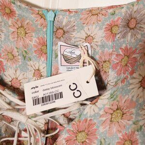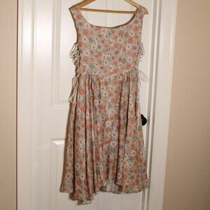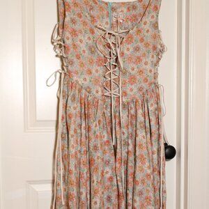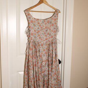 New with tags 100% linen sundress from Linennaive. Corset lacing on bust and sides, zipper down back. Full circle skirt, with pockets! Light blue background with pink, white, and greyish lavender daises. Marked size 3x but fits smaller, like 2x.