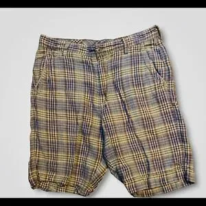 Tommy Bahama plaid linen relaxed shorts. Front zip and button closure. Flat front with side slit pockets and two flat back pockets. EUC