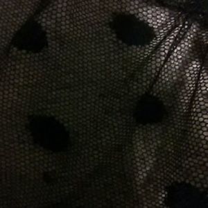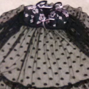 Black with Polk a dots. Small. Has bows on straps and in the center of cups. Floral light pinkish/purple design on cups.