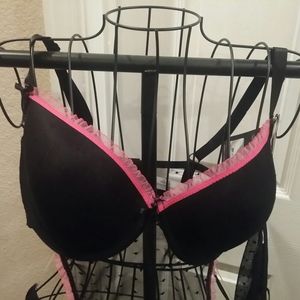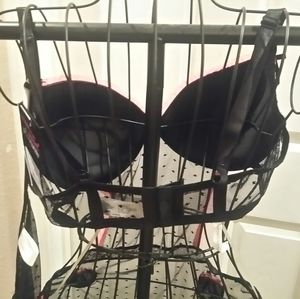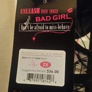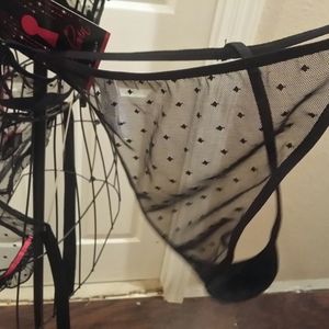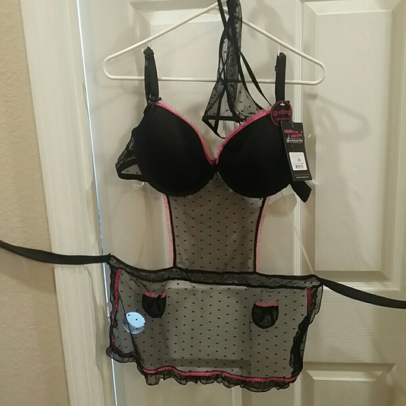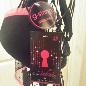 Black and pink bra with attached lace apron that ties and gstring .. new with tags