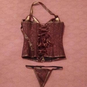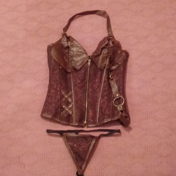 Beautiful dark brown pleather polyester and spandex corset ties up in the back zips up in the front with a g-string to match size small