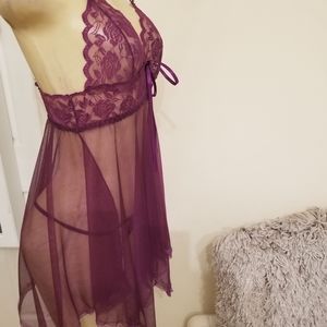 Purple chemise with lace trim with matching thong. Size S