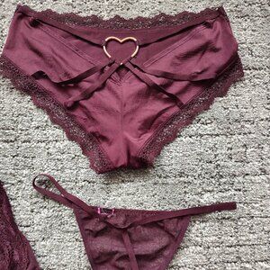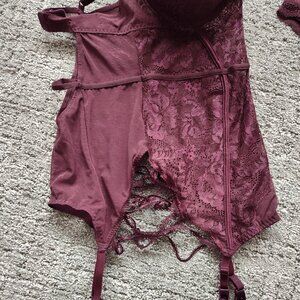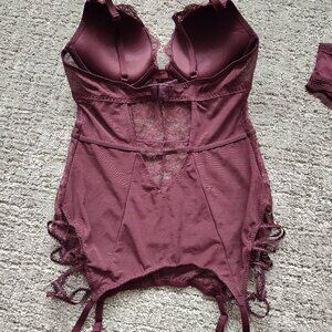 Lace 34B bustier/corset garter with cross cross detail at hip. Push up. Comes with 2 matching panties: sheer thong and sz small cheeky cut with metal heart detail in back.