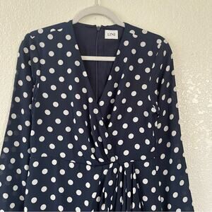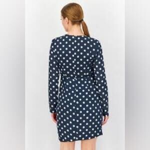 Features: navy with white polka dots long sleeve faux wrap dress with a draped sash