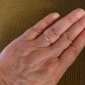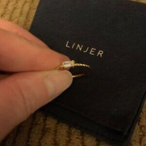 Linjer ring with pouch. US size 8. Baguette cubic zirconia with sterling silver setting plated in 14K yellow gold vermeil (note: to my eye the color looks more like 18K vermeil). This ring looks great on its own but would look adorable in a stack. It has never been worn. I just came to the conclusion that silver looks better on my skin tone.