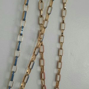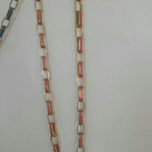 2 linked good necklaces. One baby blue and gold. One coral color and gold. Perfect length. Sold separately.