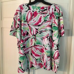 This floral top is from Links. The item is bright and fun. The neckline is also decorated. It is made from 95% cotton and 5% spandex. The size is extra large. The measurements are 25" L x 24" W x 12" sleeve (shoulder to cuff). This item has been preowned but is in great condition.