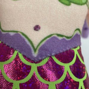0550A- Linzy Toys Mermaid plush toy doll, “Under the Sea “ Collection. approximately 14 inches tall, 8 1/2 inches wide with arms outstretched. Has purple hair and banana curls, soft and plush, gold, glittery, starfish appliqué on right side of head, printed features on the face, beige, plush body, pink and green shiny tail, all new material. Filled with polyester fiber. Surface washable only. For ages three years and up. New with tags.