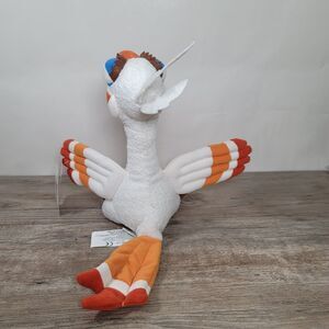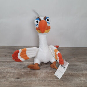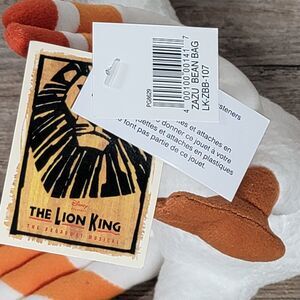 Simba plush is adorned with his warrior corset inspired by clothing from the Maasai warriors. Zazu plush still has his Broadway hang tags attached. Both measure approximately 8 inches in seated position and are in good gently loved condition with the only notable flaw being very tiny spots on Zau's head "feathers" as shown in photo.