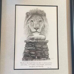 Lion & Lamb Framed Religious Artwork By Sue Christmas 1992 Rev 5:12 Bible Verse