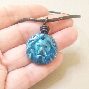 Handsome, masculine lion medallion in a vibrantly blue titanium color-wash. Comes with a 17" black cord w. a 2" extender [19" total length].