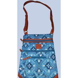 Lion Mountain Blue Floral Crossbody Bag Brown Strap Multiple Zipper Pockets