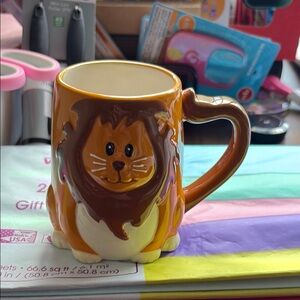 Charming lion-shaped ceramic mug. Features a playful lion design in brown and tan colors. Perfect for adding a touch of fun to your drinkware collection.