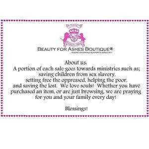 Please note: Beauty for Ashes Boutique carries t-shirts, worship flags, clothing, jewelry and accessories; many with our trademark brand name 'Beauty for Ashes' - which means God will restore Beauty in place of life's ashes - Isaiah 61:3. None of our items carry literal ashes. Instead, our items carry the blessings of God representing restoration and divine destiny for each individual.
