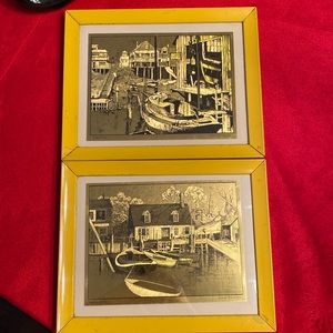 Set of two Lionel Barrymore, gold foil, etchings framed. These are very vintage. The yellow frames are metal and they are scratched. Frame size is 10 x 8 1/4. The first picture is called “water fronts” and the second picture is called “Harbor shelter”.