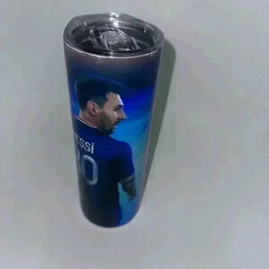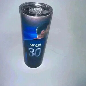 This is a pre-owned stainless steel tumbler featuring a graphic of Lionel Messi in his Paris Saint-Germain uniform. The tumbler is approximately 20 oz in capacity and has a clear lid with a slider for sipping. The tumbler has a white base with a black and blue graphic of Messi in his PSG uniform. The graphic includes the words "Messi" and "30" on the front of the tumbler. The tumbler has a small scratch on the side of the tumbler. The tumbler is in good condition with no other visible imperfections.