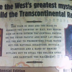 The year is 1863 and the race to connect the country by rail has begun! Sign on with either the Central Pacific or the Union Pacific and help lay track all the way to Promontory, UT. Watch out for natural disasters, buffalo stampedes and a band of ornery outlaws out to steal the golden spike and sabotage the railroad.