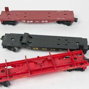 This set includes 3 Lionel vintage O-O27 gauge flat cars for model railroads: L&N 9121, U.P. 16376, and ATSF 9310. Cars show signs of wear and are missing original parts or accessories. Ideal for restoration or display collections.