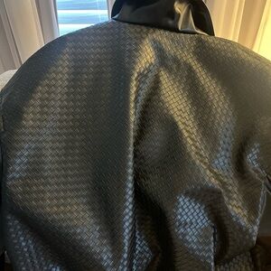Stylish black bomber jacket with a unique textured design. Features a classic collar and zip closure. Perfect for a modern look.