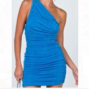 Step out in style with this stunning blue one-shoulder dress. Perfect for any occasion, this dress offers a flattering fit and a chic design.