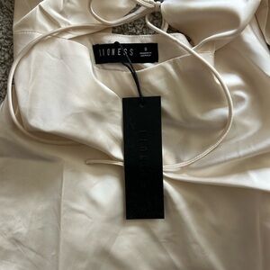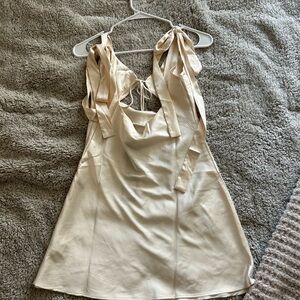 This stunning cream mini dress by Lioness features a chic cut-out design with a tie front, perfect for a night out or cocktail event. The sleeveless babydoll style is enhanced by flutter sleeves and a plunging neckline, offering a sophisticated yet playful look. Its mini length and elegant silhouette make it a standout piece for any special occasion.