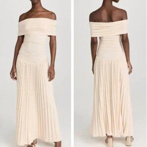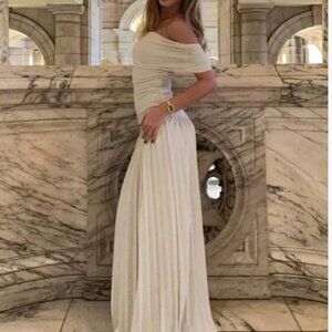 Elegant off-shoulder design. Pleated skirt. Perfect for formal occasions.