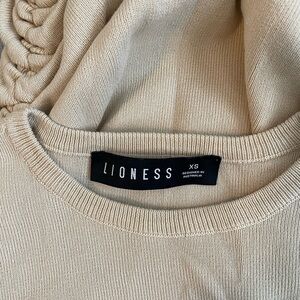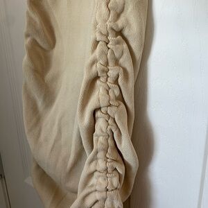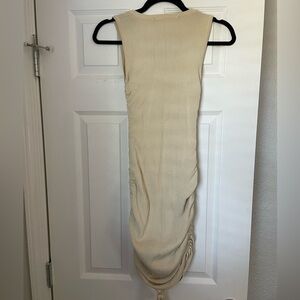 Chic cream midi dress with elegant ruching. Sleeveless design for versatile styling.