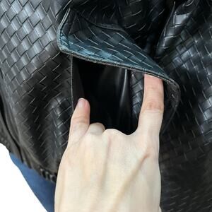 Woven faux leather bomber jacket. Zip up. Has front pockets. Oversized fit.