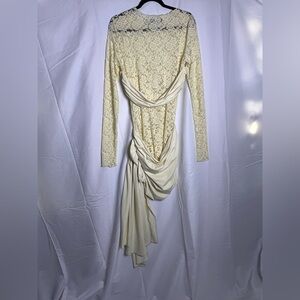 Chic long sleeve dress with lace overlay. Features elegant draping and bow detail. Perfect for stylish occasions.