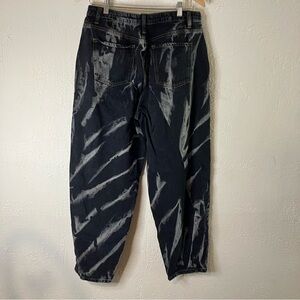 In excellent used condition no rips, tears or stains. Mom style jeans, five pocket style, tie dye print, relaxed leg, tapered from knee, belt loops, high waisted high rise and zipper closure.