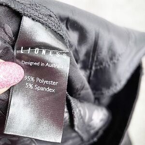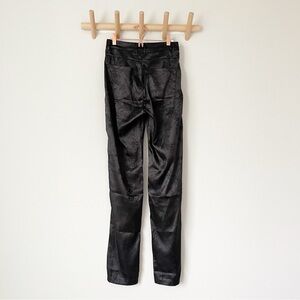 Shiny black pants with matte floral print. High rise, long length fit. In good condition with no visible flaws.