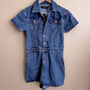NWT. Women’s Lioness U Know What’s Up Chic denim romper with short sleeves. Features belt loops, 2 chest pockets, 2 front angled pockets, 2 back pockets and full front button closure.