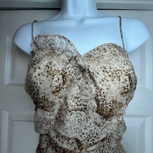 New With Tags. For sale is this women's Lioness Under the Same Sun mini dress, size medium. This animal print slip dress is fully lined and features spaghetti straps, drawstrings at the bodice and bottom, invisible back zipper, and ruffles along the bodice. Perfect for a night out or as a cocktail dress.