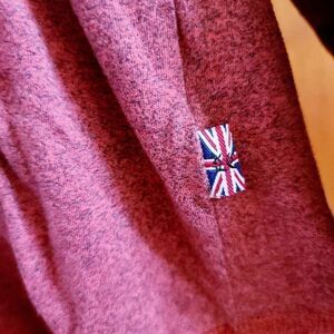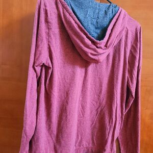 Men's red/grey and black, hooded, long sleeve top with adjustable strings and a front pouch pocket.