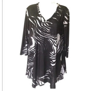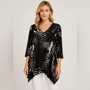 Lior Paris Allison tunic in black and white animal print. V neck. 3/4 sleeves. Handkerchief hem. Details in photos. *** fabric / care tag is missing. 95 polyester / 5 spandex. Machine washable. Bust 21” length 30” - 33” Excellent condition. Size S