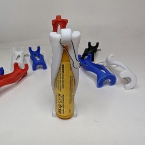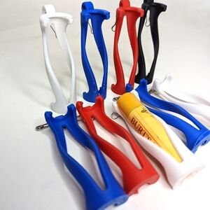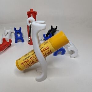 Set of nine lip balm holder keychains. Comes in four colors with silver hooks to connect to your keys, purse, backpack and more. Chapstick slides in through the middle and rotates to snap into place.