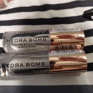 lip bundle includes two revolution makeup hydro bomb with vitamin e lip gloss, one honest beauty liquid lipstick color fearless, one on his beauty liquid lipstick color happiness and one revolution makeup matte lipstick color spice