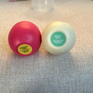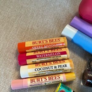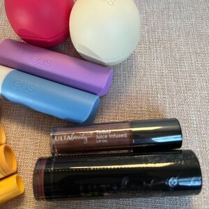 All new. 4 Eos lip balms- taken out of cardboard backing, but never used. 2 summer collection chapsticks, sealed. 3 Burt’s Bees lip balms and 1 shimmer lip balm, sealed. Sealed Ulta brand dark red lipstick and brown hued lip oil.