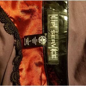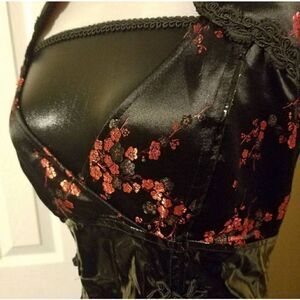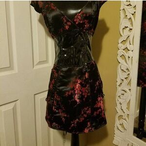 2010 "Looks That Kill" line. Brocade and PVC low cut babydoll style mini dress with satin corset lacing along an otherwise open back. Absolutely gorgeous and in excellent like new condition.