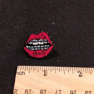 Stylish enamel pin featuring pink lips with braces. Perfect for adding flair to any outfit.