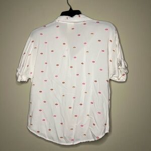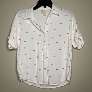 Short sleeve button down white blouse with lip print. Size small. 100% viscose.