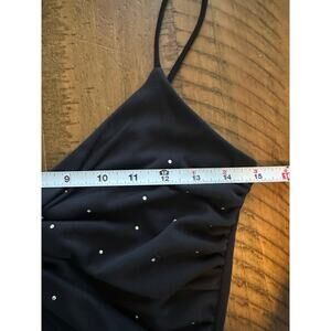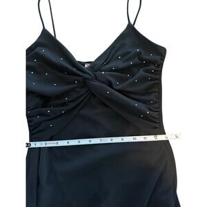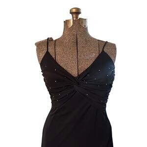 Elegant vintage Y2K Lipstick brand black maxi dress in size Small. Features a flattering twisted knot front bodice with subtle ruching and scattered bead embellishments at the bust. Spaghetti straps with a deep V neckline and a flowing floor-length chiffon-style overlay skirt. Fully lined in polyester for comfort and shape.