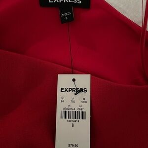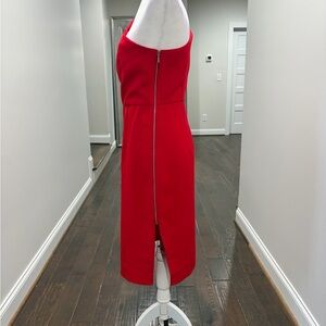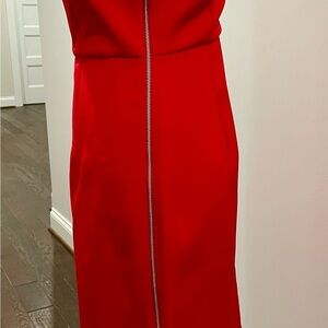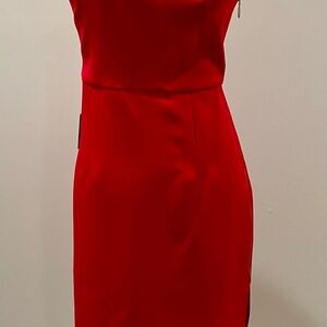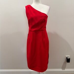 Chic one-shoulder design with exposed silver side zipper for added effect. Beautiful lipstick red color. Perfect for date night or a holiday party.