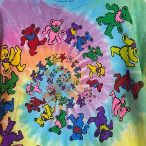 Original Grateful Dead Spiral Dancing Bears tie-dye T-shirt by Liquid Blue in a size Large. Classic psychedelic spiral tie-dye pattern with colorful dancing bears spiraling into the center. Officially licensed Grateful Dead merchandise marked ©1995 GDM, Inc. on the print.