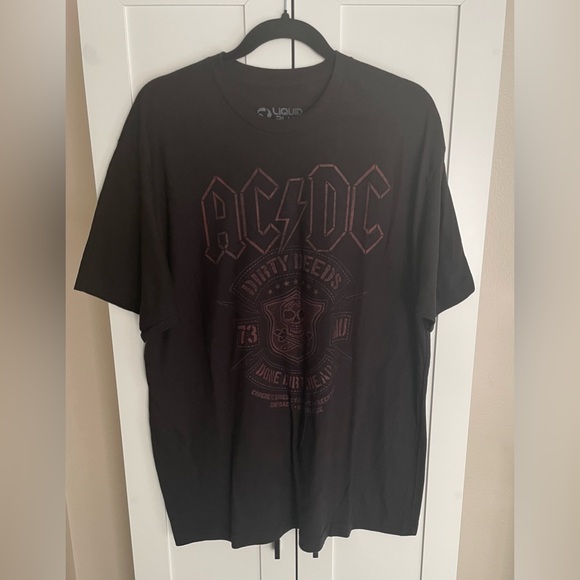 Bold ACDC design on a black tee. Perfect for music fans. Comfortable and stylish.