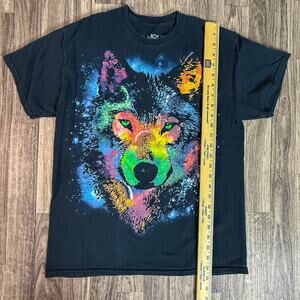 Step into cosmic style with this Liquid Blue Rainbow Galaxy Wolf T-Shirt in size Medium. Featuring a vibrant, multicolor wolf graphic on a starry galaxy background, this tee blends bold animal art with psychedelic flair. Made from 100% pre-shrunk cotton, it’s soft, breathable, and built to last. Perfect for fans of spirit animals, vintage-style graphics, or unique statement tees.