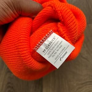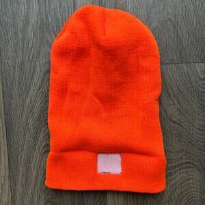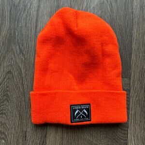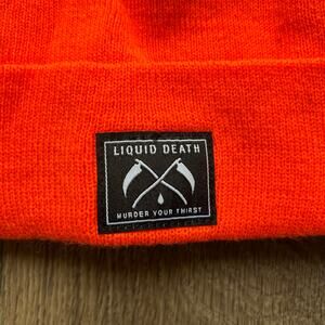Bright orange stretch knit beanie. This hat has a patch with liquid death on it as well. It is one size fits all.